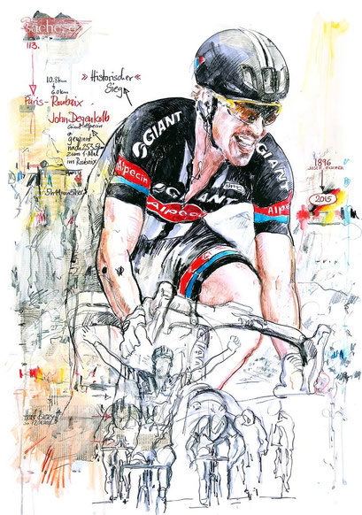 Der Polizeimeister aus Frankfurt hat er sich in den letzten Jahren als Klassikerfahrer einen Namen gemacht. Im Frühjahr starten in der Region Belgien & Nordfrankreich legendäre Eintagesrennen, die schon vor über Hundert Jahren das erste Mal ausgetragen wurden. Der Höhepunkt ist das Radrennen von Paris nach Roubaix, die Königin der Klassiker. Da John als Sprintstarker Allrounder, der auch auf hügligem Terrain zurecht kommt, besonders gerne diese langen Rennen über 300 km fährt, war es sein Kindheitstraum einmal Paris-Roubaix zu gewinnen. Schon letztes Jahr 2014 wurde er durch einen Sprint in der Verfolgergruppe Zweiter. In diesem Jahr (2015) machte er dann alles richtig: Er war auf den kantigen Kopfsteinpflasterpassagen immer ganz vorne dabei und setzte dann eine bärenstarke Konterattacke kurz vor Ziel, um zwei Ausreißer einzuholen und im 6-Mann-Sprint zu gewinnen. Sein größter Triumph. Glückwunsch!